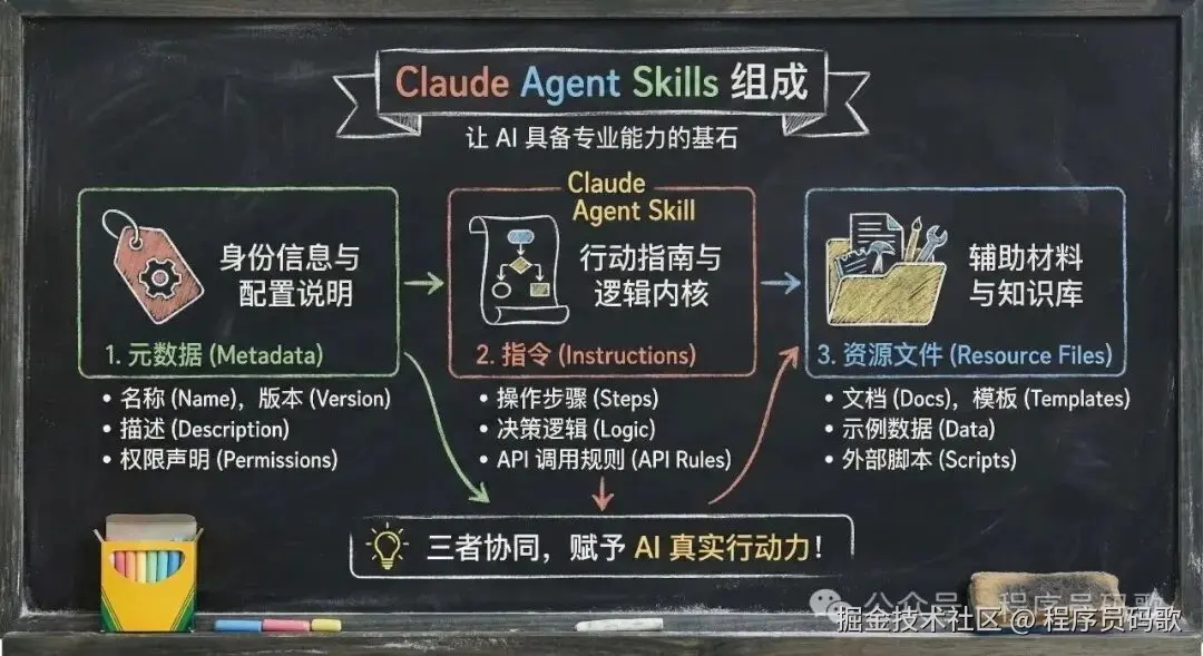 在 AI 界,Skills 就是让大模型按照特定的方法论去行动的机制,你可以理解为“超级进化版的提示词”,通常由三部分组成: