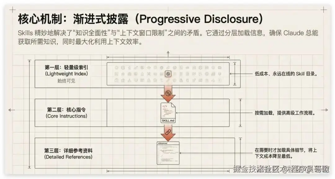 Skills 最核心的机制是通过渐进式披露 (Progressive Disclosure),通过分层加载信息,确保 AI 总能获取所需知识,同时最大化利用上下文的效率。