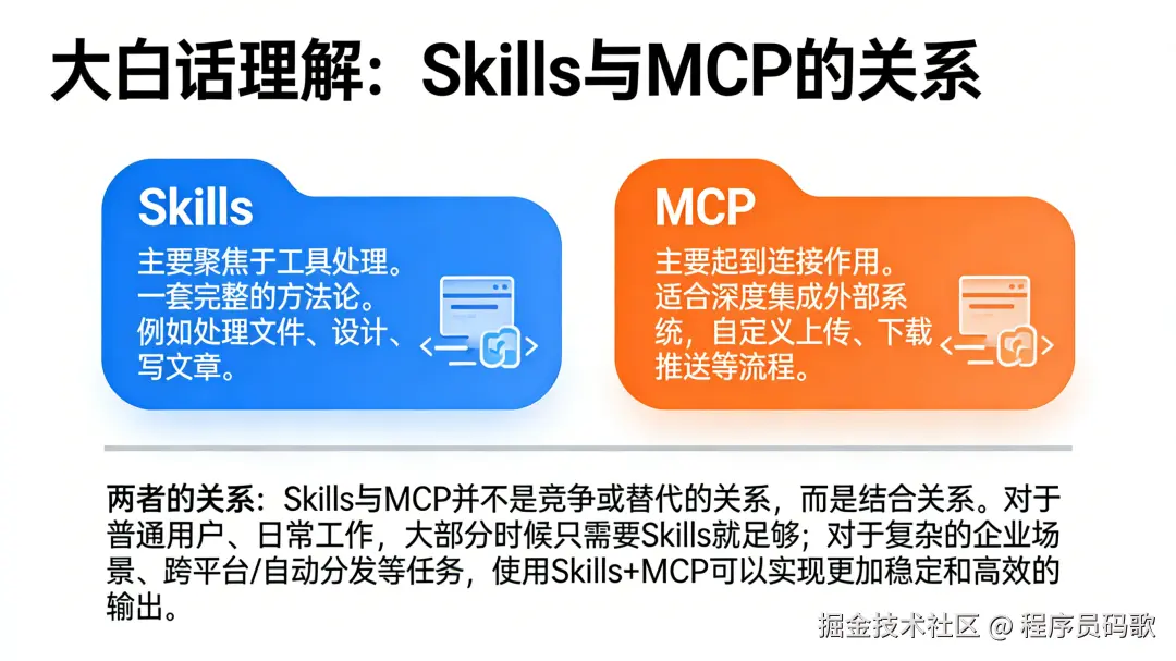 两者的关系: Skills 与 MCP 并不是竞争或替代的关系,而是结合关系。