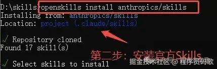 第二步、安装官方Skills,需能访问github openskills install anthropics/skills