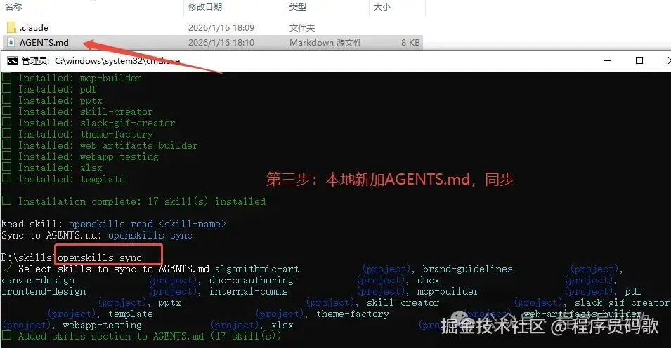 第三步、创建AGENTS.md ,执行同步命令 openskills sync
