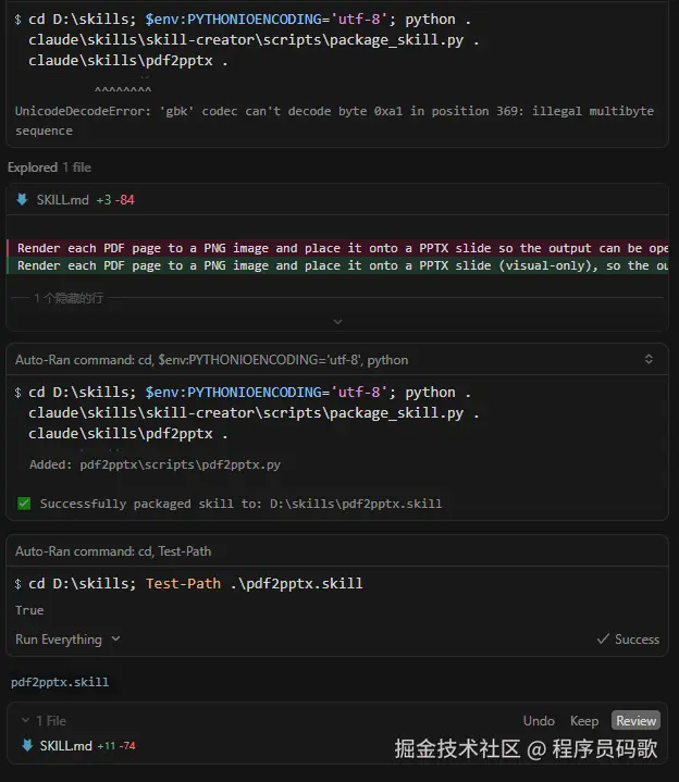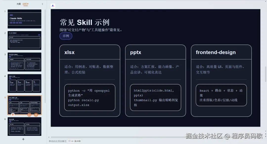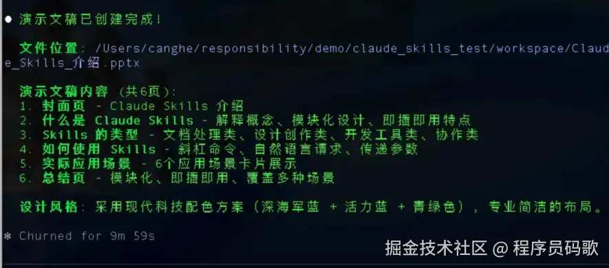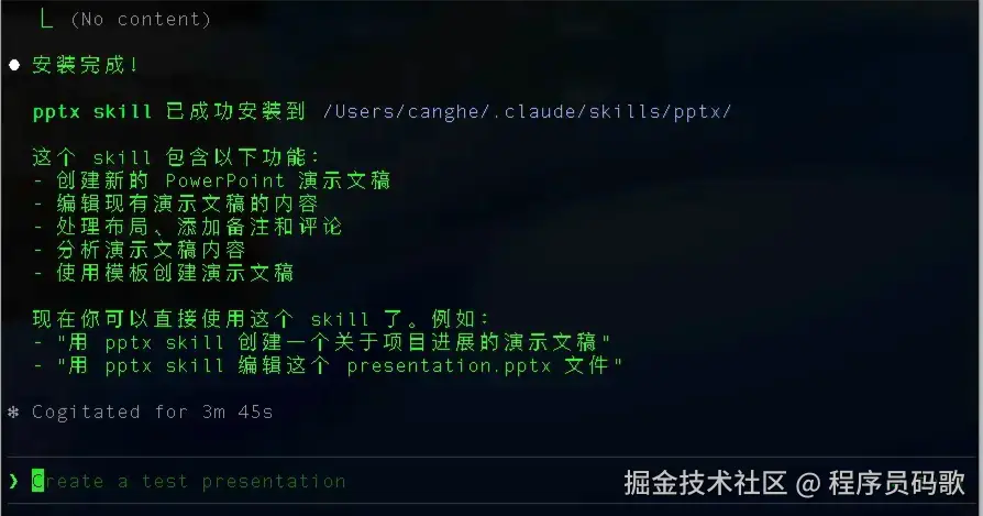 一把梭生成的效果还是非常不错的,一个做 PPT 的 skill 就这样安装好了。