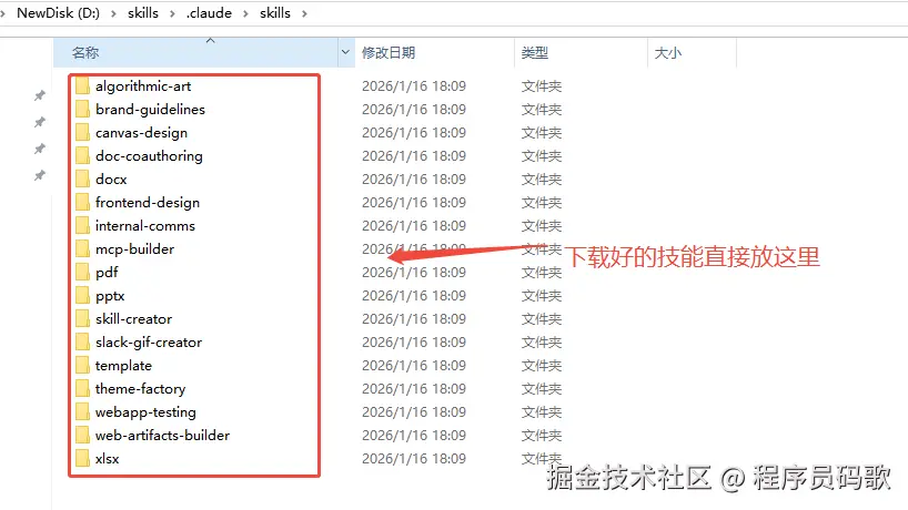 下载 skill 安装包,然后直接放到 .claude/skills/,这个目录下: