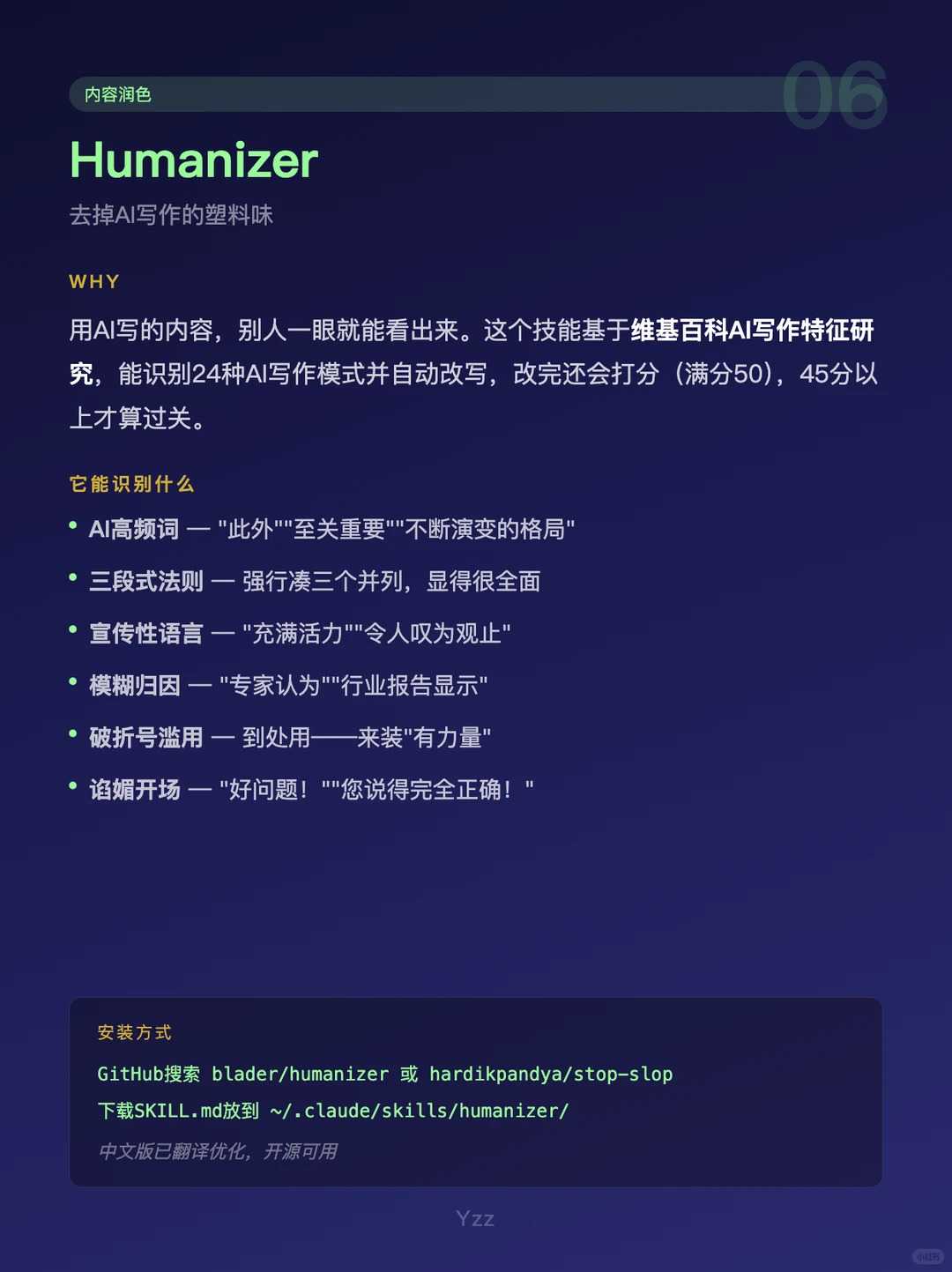 6. Humanizer — 用AI写完初稿再跑一遍,自动把"此外""至关重要"这些AI味词汇干掉。发出去读起来像人写的,客户都说最近的文案“有灵魂了”。