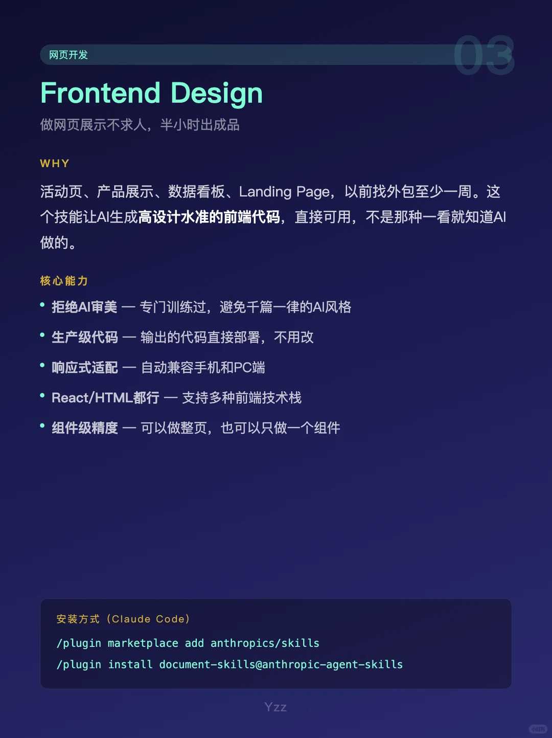3. Frontend Design :不懂设计和代码的福音。它可以强迫 AI 摒弃那些泛滥廉价的“AI味”,基于强烈的美学观点生成具备极高审美、达到生产级水准的系统交互界面。 向上级汇报业务逻辑或向跨部门宣讲时,直接扔出一张高保真的交互视觉图,让沟通成本直线下降。