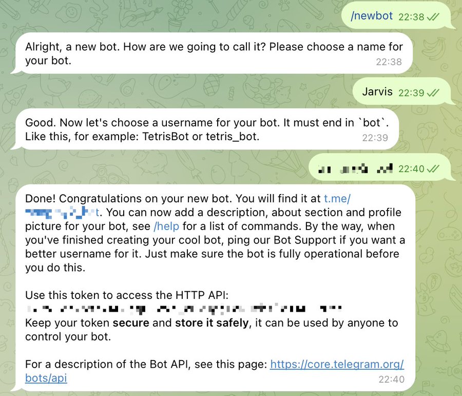 4)如果你选择用Telegram 在 Telegram 搜索@BotFather对话,新建 /newbot,获得token,复制粘贴回配置中。